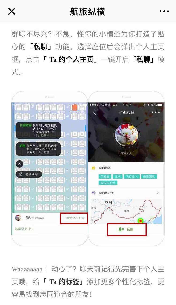 推文中提到,同机乘客可以在选座页面进行群聊,还可以点击用户主页进行私聊,同时能为其他乘客添加个性化标签。