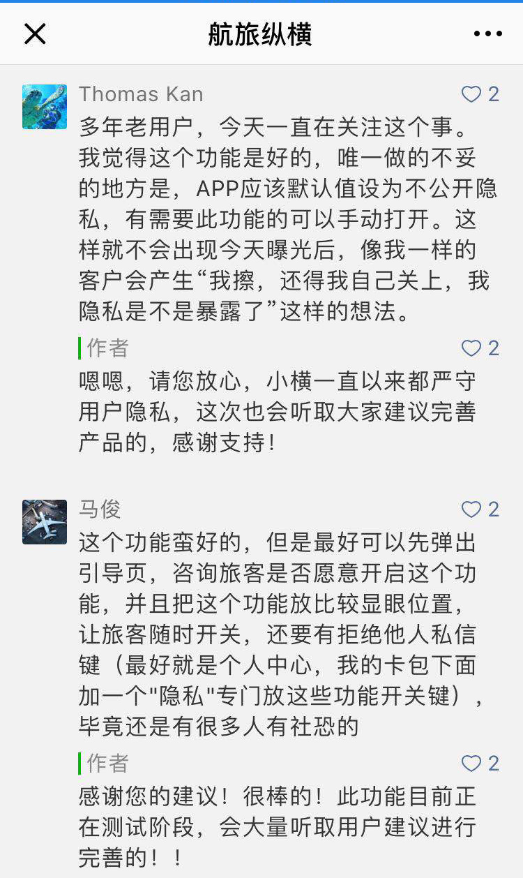 有用户在航旅纵横的微信文章后留言,提到应该默认设置为不开启以及提示不明显的问题,航旅纵横的回复默认了这些问题的存在。