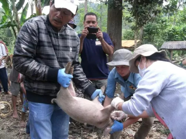 图2. 造成数十人死亡的未知病毒于2005年在菲律宾爆发,世卫组织派出团队协助调查后,证实元凶为尼帕病毒。图为调查人员采取家猪血样进行分析。(图片来源:美国疾病预防控制中心)