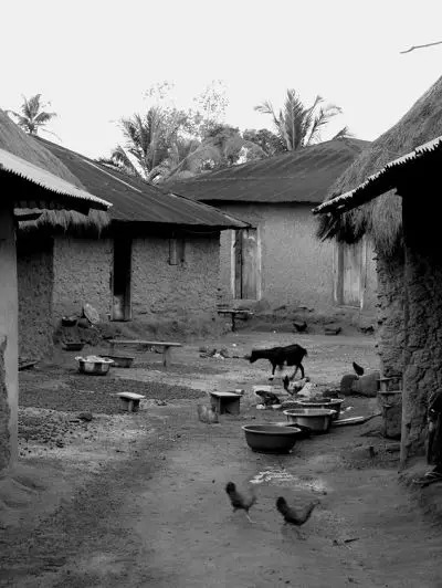 图1. 塞拉利昂某村庄的街道,照片拍摄前数分钟,一位妇女在走廊尽头的房间中死于埃博拉病毒感染。她在另外一座城镇参加了埃博拉死亡病患的葬礼后染病。不幸的是,在她死亡之后,这座村庄又有数十人因受到她的传染而患病致死。(图片来源:美国疾病控制预防中心)