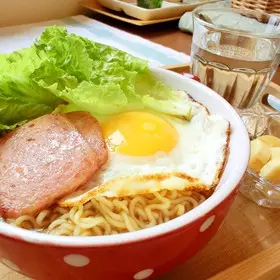 4、餐蛋面 - 港都是公仔面之都,大街小巷各种茶餐厅都主打餐蛋面,嗯嗯,就是午餐肉煎蛋公仔面。为什么是这个搭配?茶餐厅始见于70年代经济刚刚起飞的港都,普罗大众工作繁忙收入有限,而罐头食品既方便又耐存,是千家万户的必需品,久而久之,午餐肉搭配公仔面再加只煎蛋(蛋白质啊)就成为“快靓正”茶餐厅的标配了。