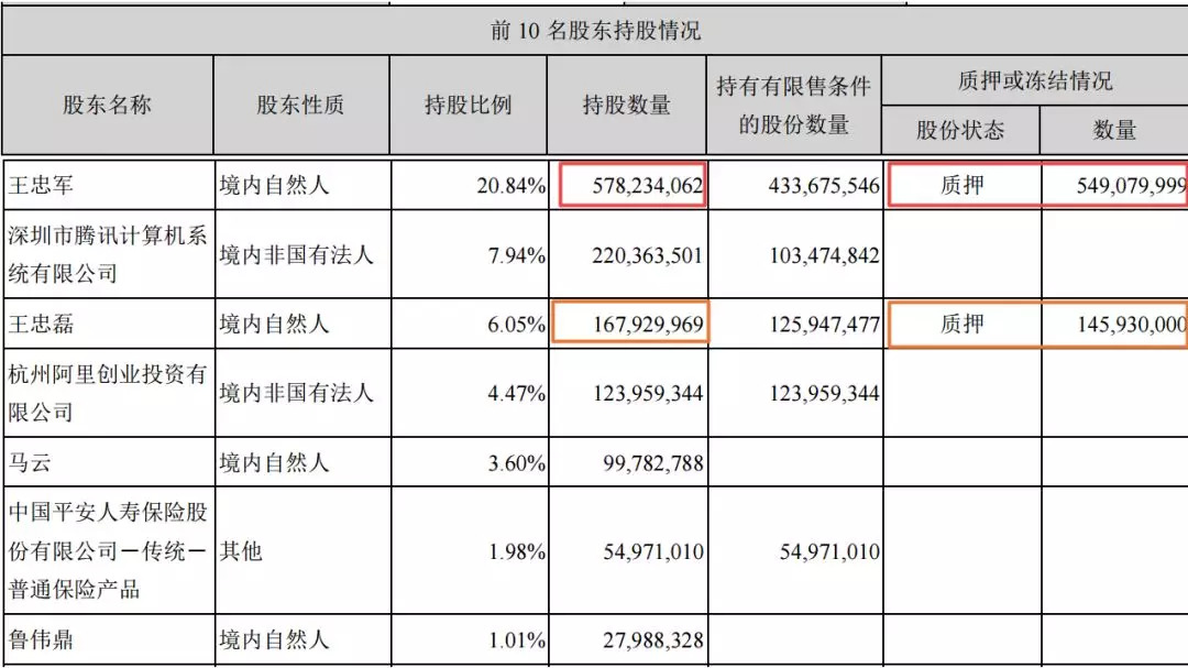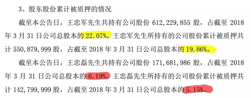 截至6月6日,王忠军持股占总股本22.07%,累计被质押股份总股本的 19.86%,个人的股权质押率达到89.99%。王忠磊持股占总股本的 6.19%,累计被质押股份总股本的 5.15%,股权质押率83.20%。