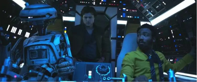 L3-37(左),汉·索罗(中)和兰多·卡瑞森(右)在《独唱:星球大战》中乘坐千年隼号