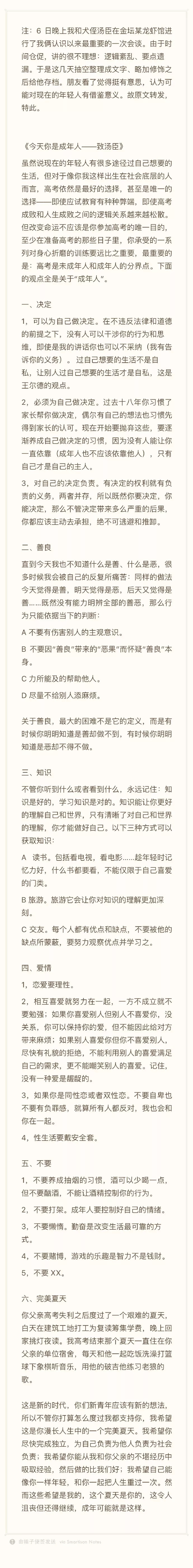 于是这几天抽空整理成文字、略加修饰之后给侄子存档——《今天你是成年人——致汤臣》。
