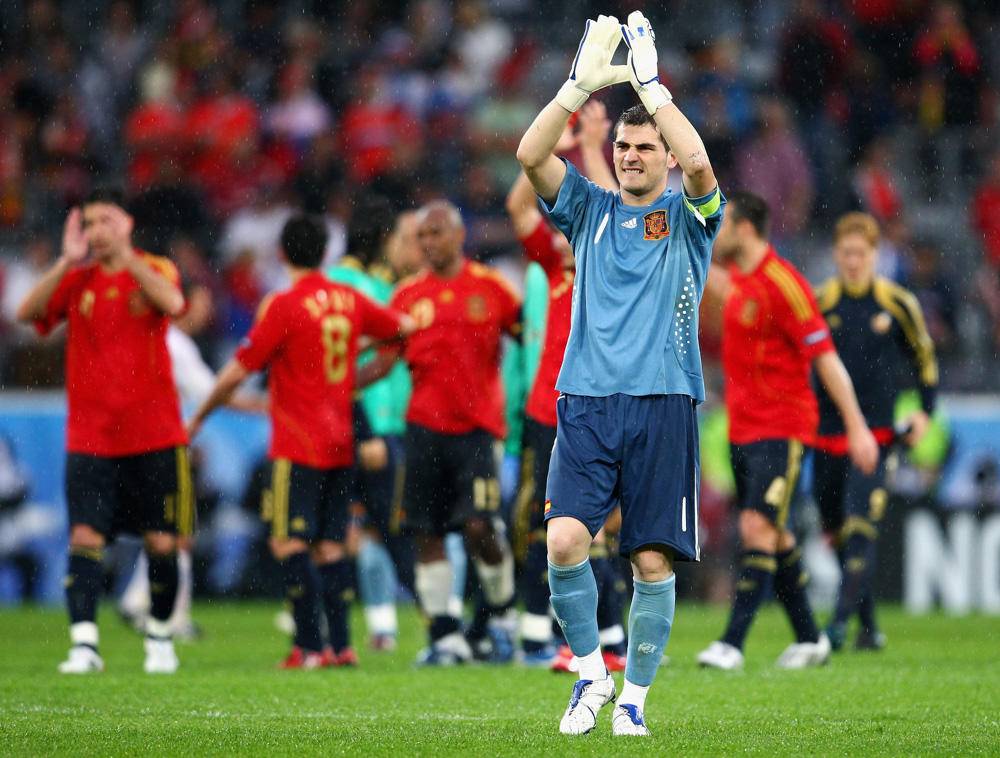 不到10岁,西班牙人卡西利亚斯就进入了皇马的训练营。19岁入选西班牙国家队,21岁在2002年的韩日世界杯崭露头角,之后接过劳尔的队长袖标,在2008年欧洲杯带领西班牙夺冠。不得不提那年卡西在皇马的表现,有如神助,数次扑下对手的必进球,让皇马提前卫冕西甲冠军。卡西的身体在守门员这个位置并不占优势,胜在反应快和状态好,2012年以前的“圣卡西”,无论是在俱乐部还是国家队都是自家球门前最可靠的防线。