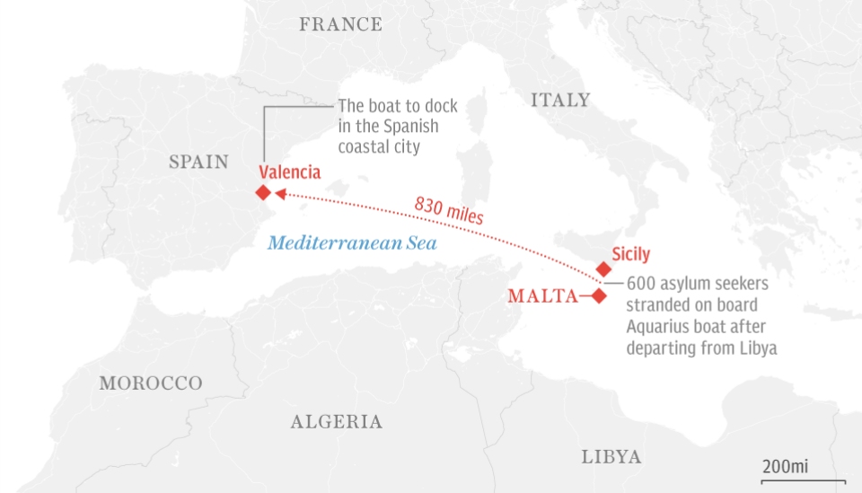 周一当天,西班牙政府挺身而出化解危机,宣布允许“水瓶座”号停靠瓦伦西亚。新上任的西班牙首相桑切斯在声明中表示:“我们有义务帮助避免人道主义灾难,并为这些人提供安全的港湾,从而遵守国际法的义务。”