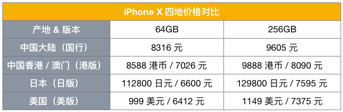 以 iPhone X 为例,从各地苹果官网公布的 iPhone X 售价看,美版 iPhone X 在定价上是四个版本中最低的一个,999 美元起步的售价折合人民币后约 6412 元,自然也是最受欢迎的;而更大的 256GB 版本为 1149 美元,约合人民币 7375 元,差价对比国行同配版本也高达 2200 元。