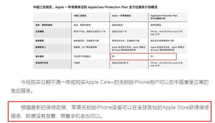 有网友发现,苹果近期悄然修改了保修政策,今后在保修期(一年)或 Apple Care+ 延保期以内的 iPhone 都能在全球 Apple Store 获得保修服务。即便是在用户“没有发票”的情况下,都能带着非国行的机器到国内 Apple Store 进行维修。