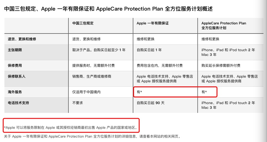 而就在这段文字描述的下方,新闻还附上了一张苹果官网的售后服务概述: