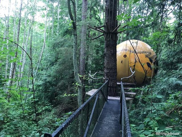 Free Spirit Spheres这个球型树屋特别像一颗巨型坚果,它位于温哥华西海岸的雨林里。这里有三种房型可选,印着乐谱的房间就是Melody房型,需要沿着环形木梯进入屋内,没有什么危险。而且这树屋一开始看上去你会以为是铁的,实际是玻璃纤维和木材手工制成,下雨刮风大雪都无需担心。房间里大大小小的五金件都是由设计者Tom Chudleigh亲手打造的,就连室内的电路系统也是他自己铺设的,从外到内都是纯手工,体验一次很是值得。