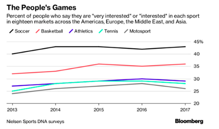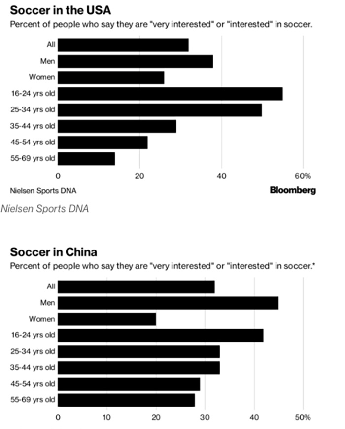 根据尼尔森公司的调查结果,足球项目在这两个国家中都还有非常大的上升空间。在美国和中国,有32%的受访者表达了对足球运动的兴趣,并且年轻人要比他们的上一辈更加青睐足球。“足球在不同国家和文化中极高的普及率,使得他们从体育项目中脱颖而出,获得了更高的媒体价值和更多的赞助商,”尼尔森体育的全球运营主管格伦·洛维特表示。