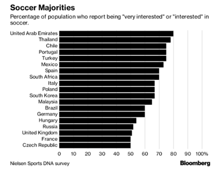 这一数据来源于尼尔森公司在6月12日公布的年度全球足球调查报告。在2018年俄罗斯世界杯即将揭幕之际,这份报告再一次确认了足球世界第一运动的地位。这份报告显示,足球依然拥有其他体育项目无法比拟的地位:足球不仅统治了全球市场,而且在主流市场中依然还有上升的空间。大多数人口选择对足球“感兴趣”的国家数量达到了19个,但是其中并不包括全球最大的两个经济体——美国和中国。