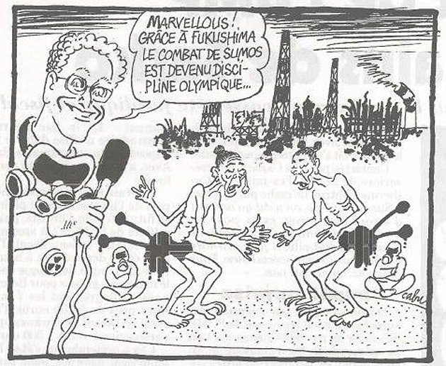 法国著名揭丑报纸《鸭鸣报》在2013年9月11日刊登了卡布的一组讽刺日本东京电力公司福岛第一核电站泄露事故的漫画。背景为2020年东京奥运会比赛现场,引人注目的是画面上的日本相扑选手因遭受核辐射变成长着三只手和三条腿的变异人。