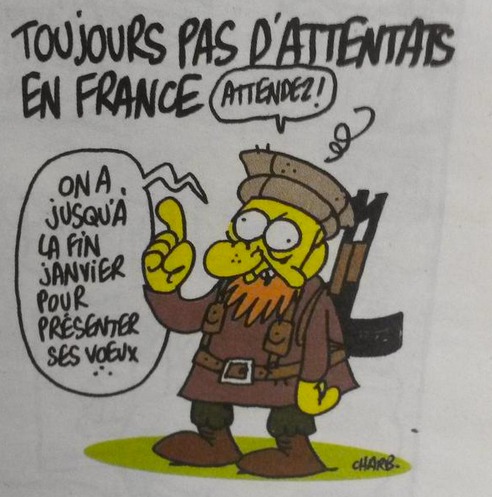 巧合的是,在这周出版的《查理周刊》中,夏尔伯的漫画竟然散发出恐怖的预感。“法国还没有发生袭击。”这位总编在他人生最后一幅漫画中这样写道,一名伊斯兰武装分子回应:“不急,一直到一月底,我们都有机会送祝福让它实现!”(法国新年有一个月的时间可以送祝福)