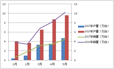 近日,中汽协公布了2018年5月份新能源汽车的产销情况——5月新能源汽车产销分别完成9.6万辆和10.2万辆,比上年同期分别增长85.6%和125.6%;而今年前5个月,新能源汽车产销均完成32.8万辆,比上年同期分别增长122.9%和141.6%。