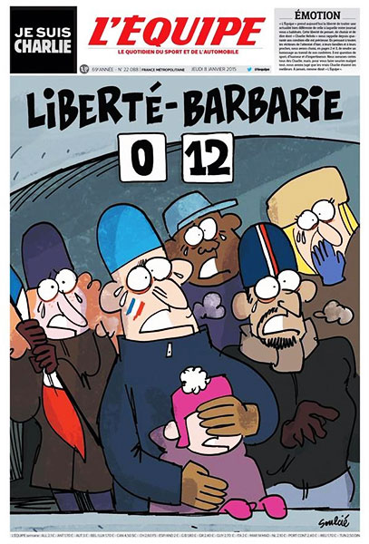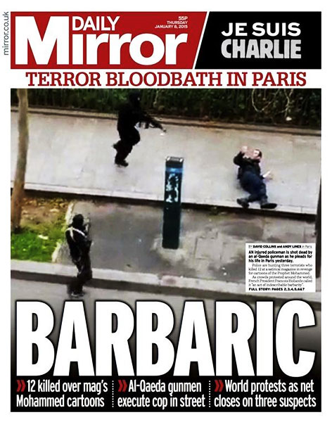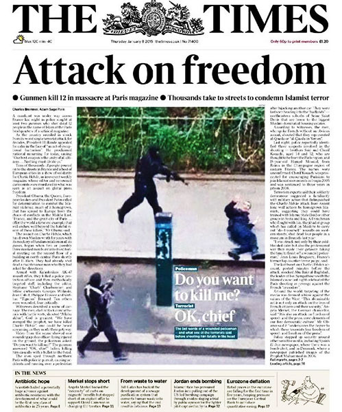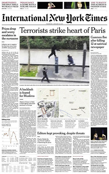 1月7日,持枪者袭击了讽刺漫画周刊《查理周刊》巴黎总部,造成12人死亡。全球各大媒体在头版头条位置报道了此次袭击事件。