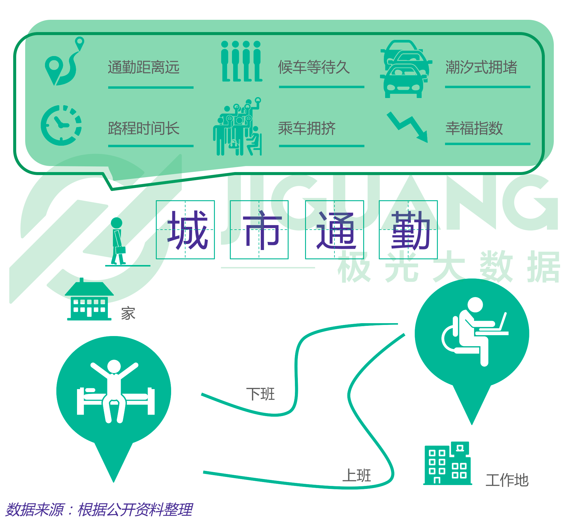 通勤指从居住地往返工作地的交通行为,是连接生活与工作的纽带。随着城市化和交通工具的发展,居住地和工作地分离的现象愈加显著;“职住分离”现象意味着通勤距离和通勤时间增长。城市的早晚高峰使得上班族候车等待时间增加,乘车拥挤和交通的潮汐式拥堵。通勤问题不仅挤占了生活工作的时间和增加经济成本,而且影响工作的心情,降低生活的满意度和幸福感。