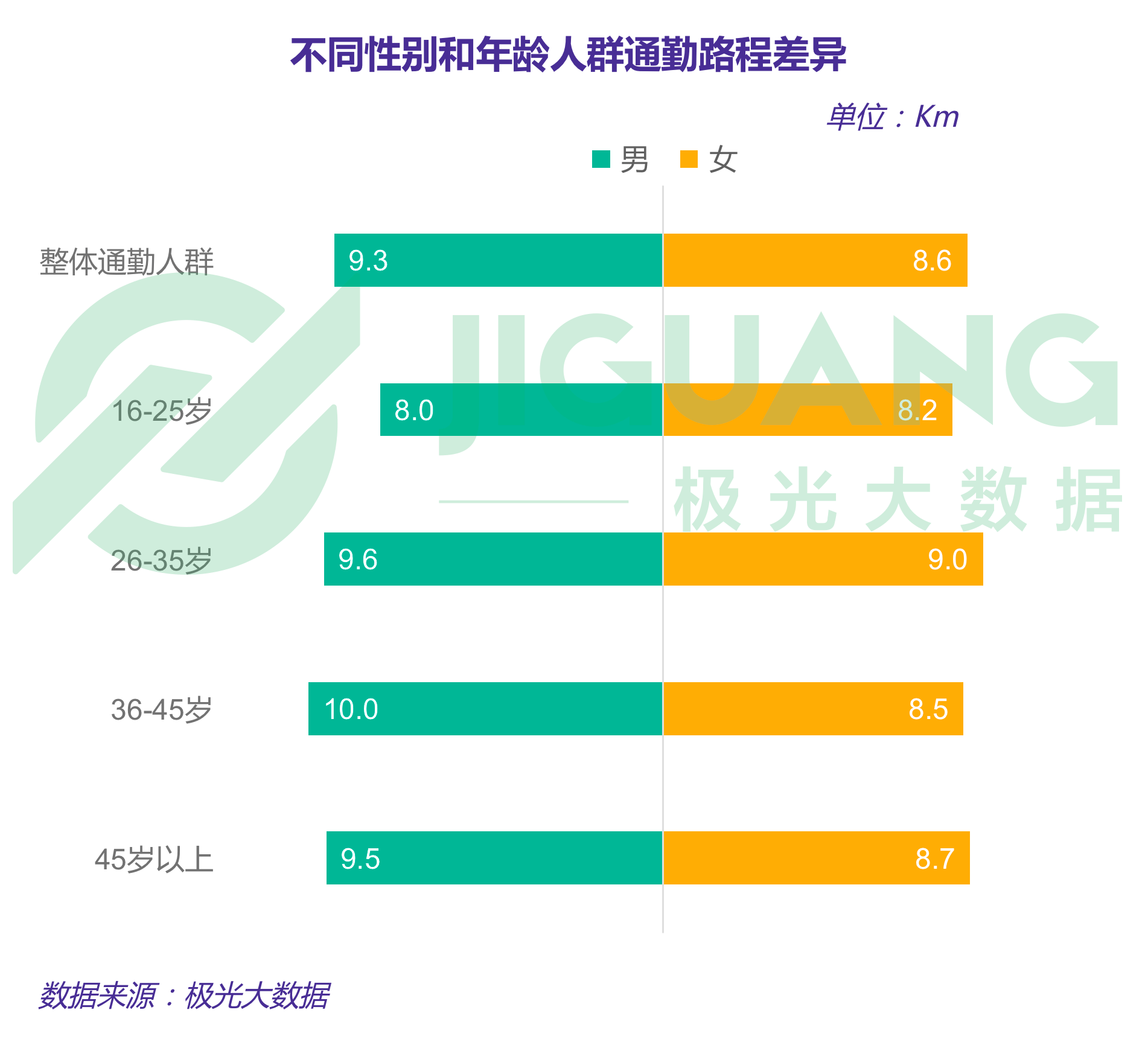 根据极光大数据iZone统计,在2017年GDP排名top 10城市中,男性通勤人群平均通勤路程为9.3公里,女性为8.6公里,男性通勤平均路程较女性长500米。36-45岁的男性通勤人群通勤路程为10公里,是四个年龄层中通勤路程最长的年龄层。