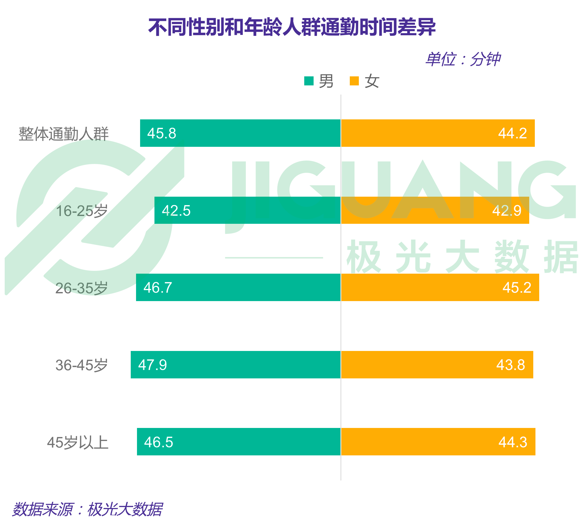 男性通勤人群平均通勤时间为45.8分钟,女性通勤时间为44.2分钟,男性平均通勤时间较女性长1.6分钟。通勤人群中,16-25岁男性人群的通勤时间最短,时长为42.5分钟;36-45岁的男性人群通勤时间最长,时长是47.9分钟。