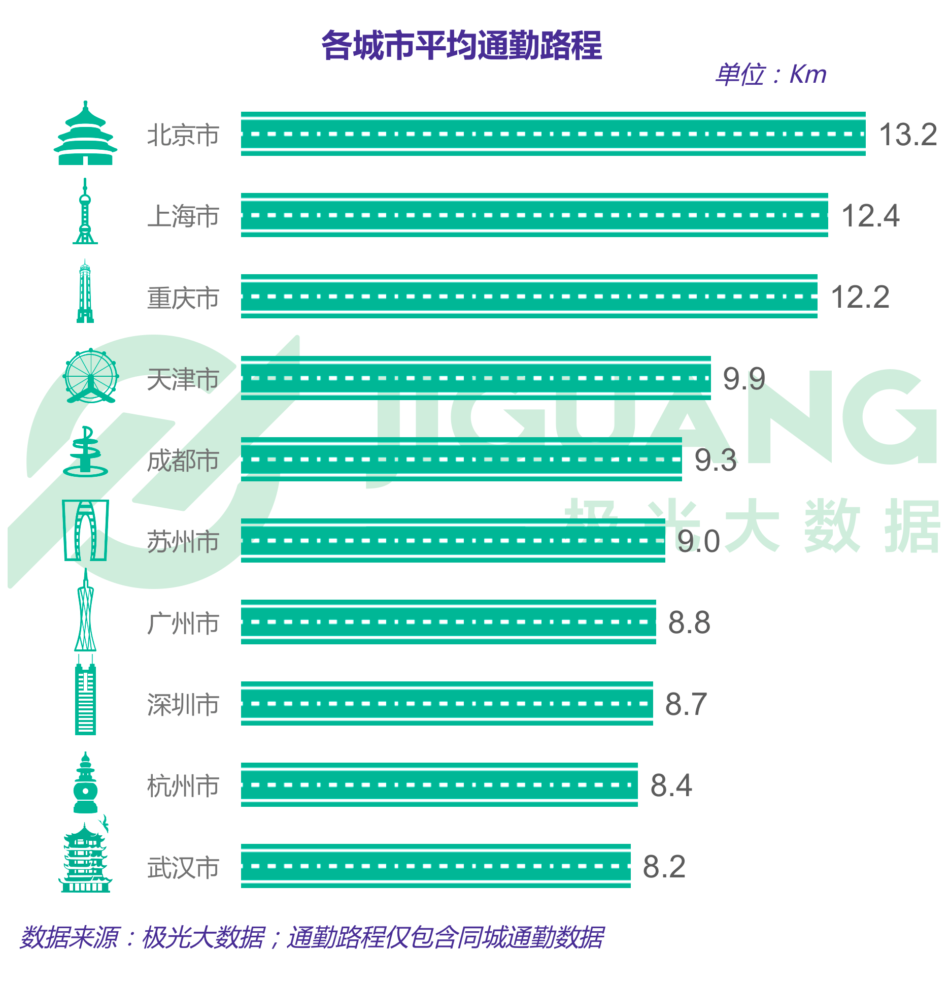 根据极光大数据iZone统计,在10个城市中,4个直辖市占据平均通勤路程排名前四位,北京的通勤路程最长,达到13.2公里;上海通勤路程排名第二,达12.4公里;重庆通勤路程为12.2公里,排名第三;而广州通勤路程为8.8公里,深圳通勤路程为8.7公里,相对北京和上海两个城市通勤路程较短;武汉通勤路程为8.2公里,比北京居民短5公里。