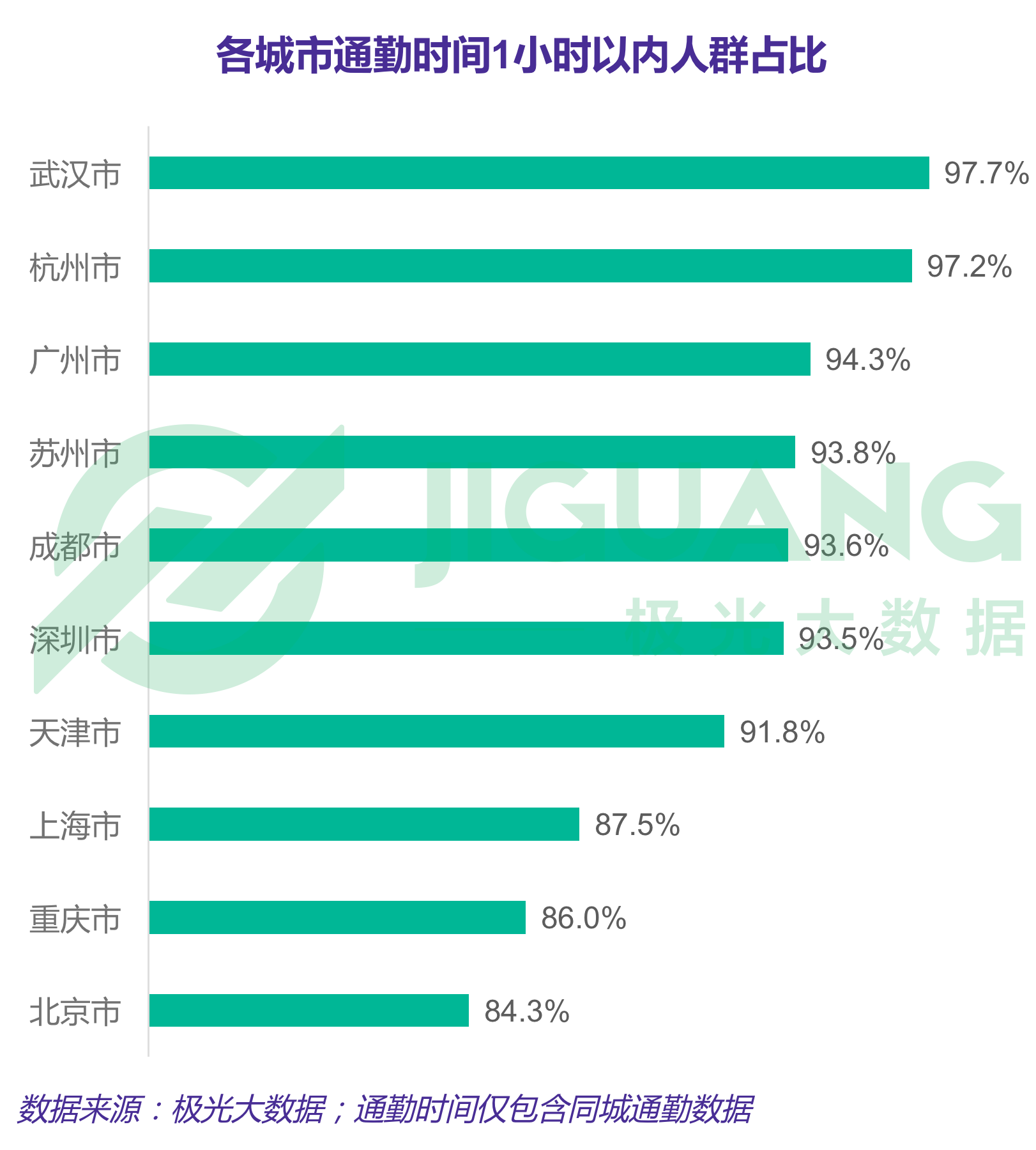 在10个城市中,有7个城市的9成通勤人群通勤时间小于1小时,其中,武汉市一小时以内通勤时间占比达97.7%,杭州市占比达97.2%,广州市占比达94.3%,分列前三甲。