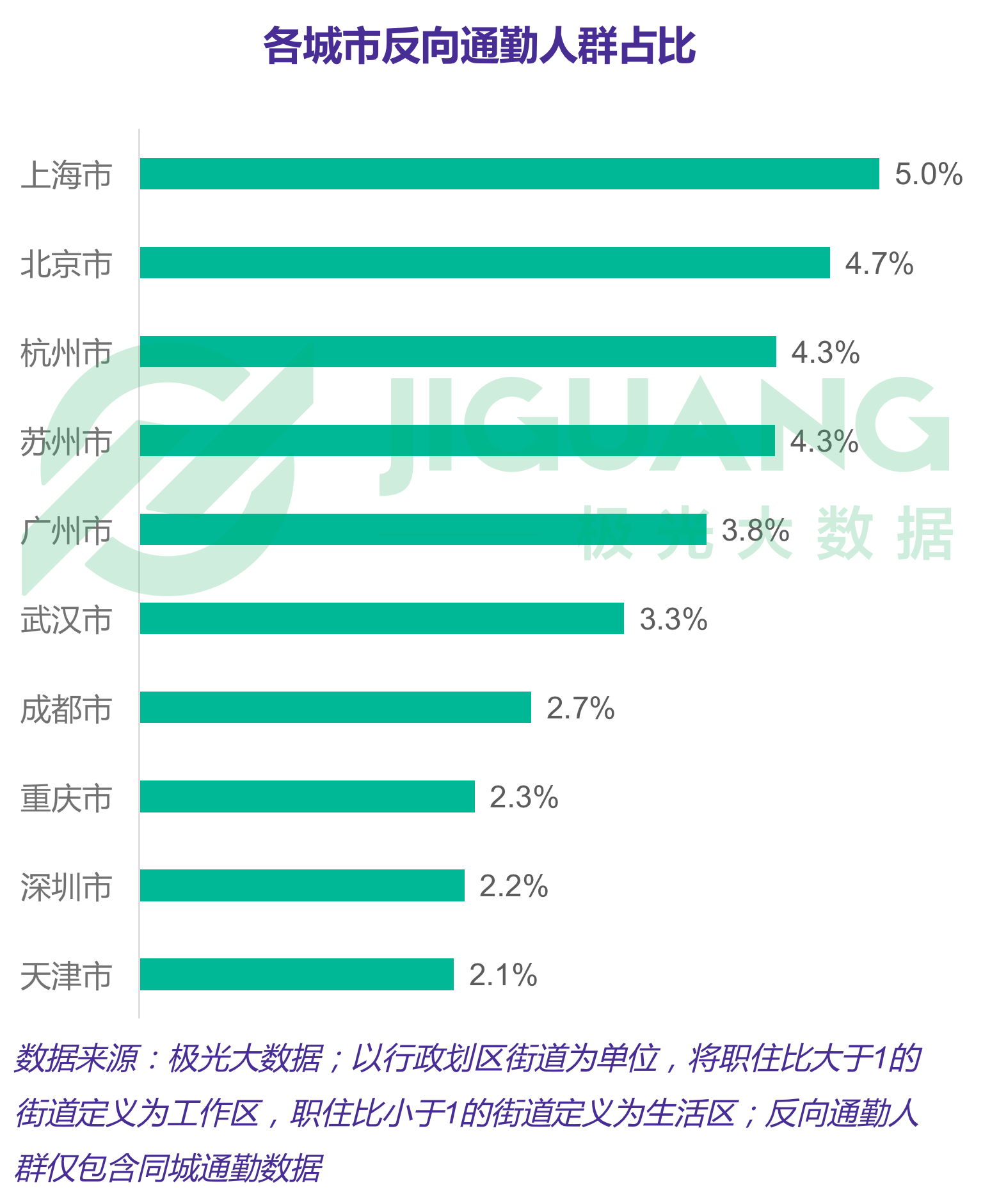 反向通勤人群指从工作区出发去生活区工作的通勤人群。上海市反向通勤人群占比达5%,北京市反向通勤人群占比达4.7%;杭州市反向通勤人群占比为4.3%。