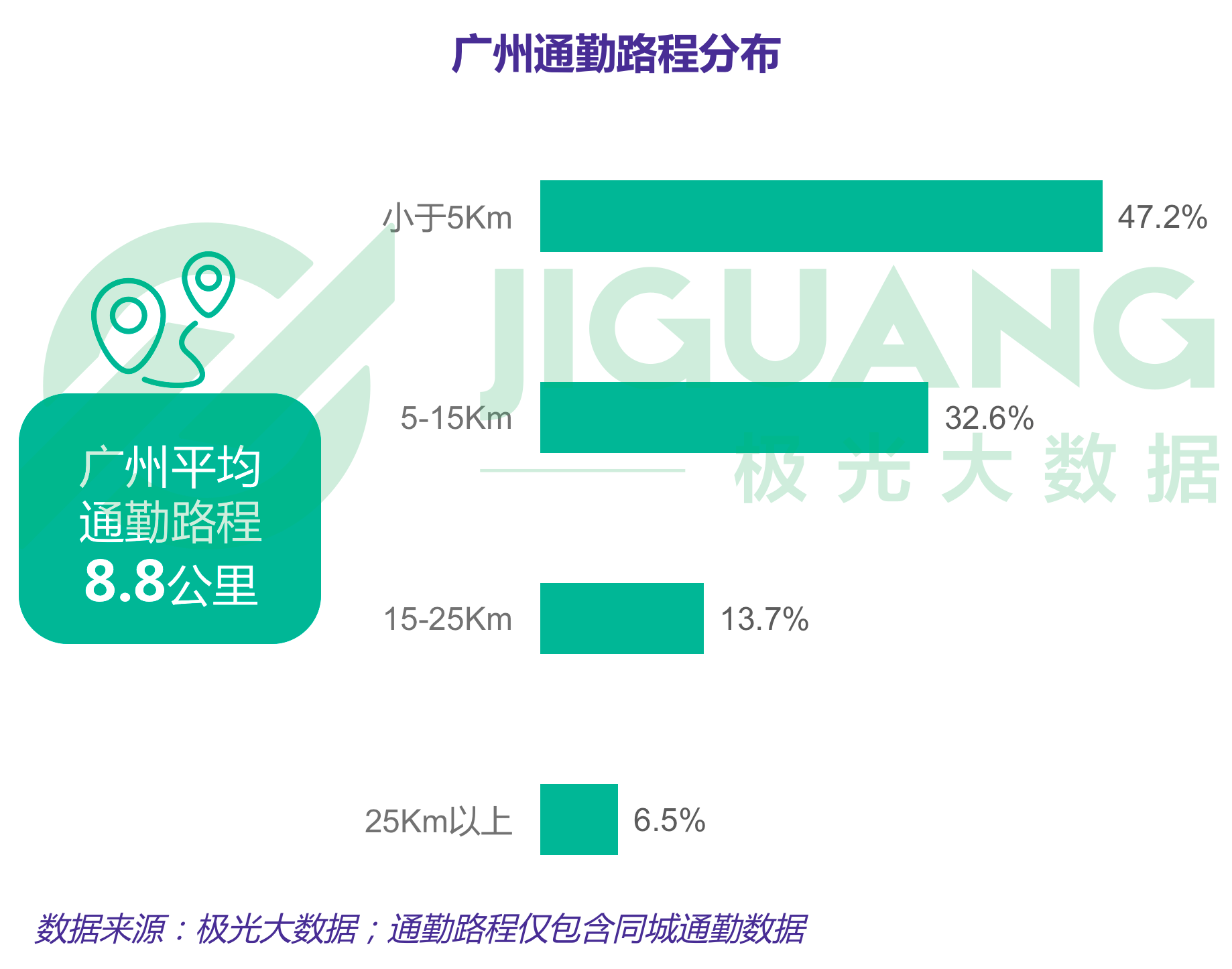广州市平均通勤路程为8.8公里,其中,47.2%的通勤人群通勤路程小于5公里,32.6%的通勤人群通勤路程在5到15公里之间,13.7%的通勤人群通勤路程在15到25公里之间,6.5%的通勤人群通勤路程超过25公里