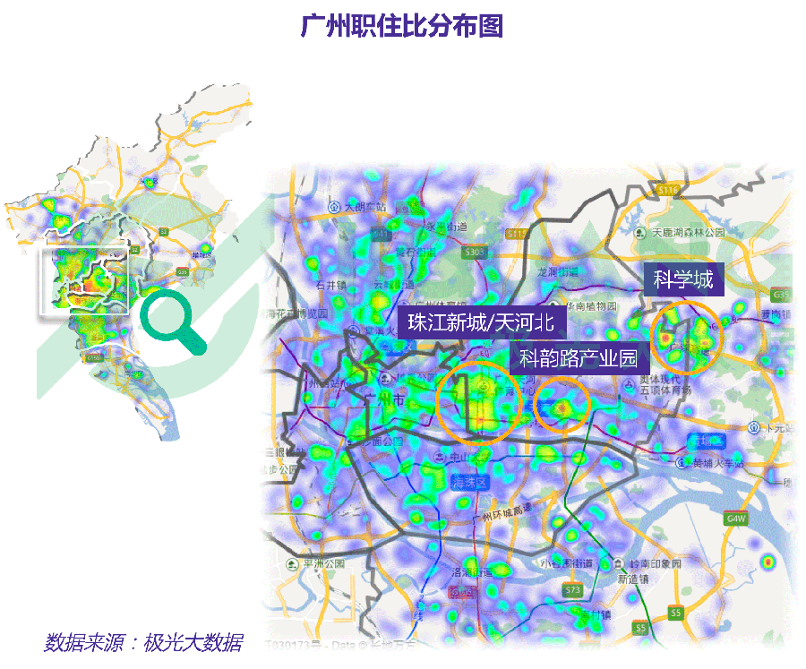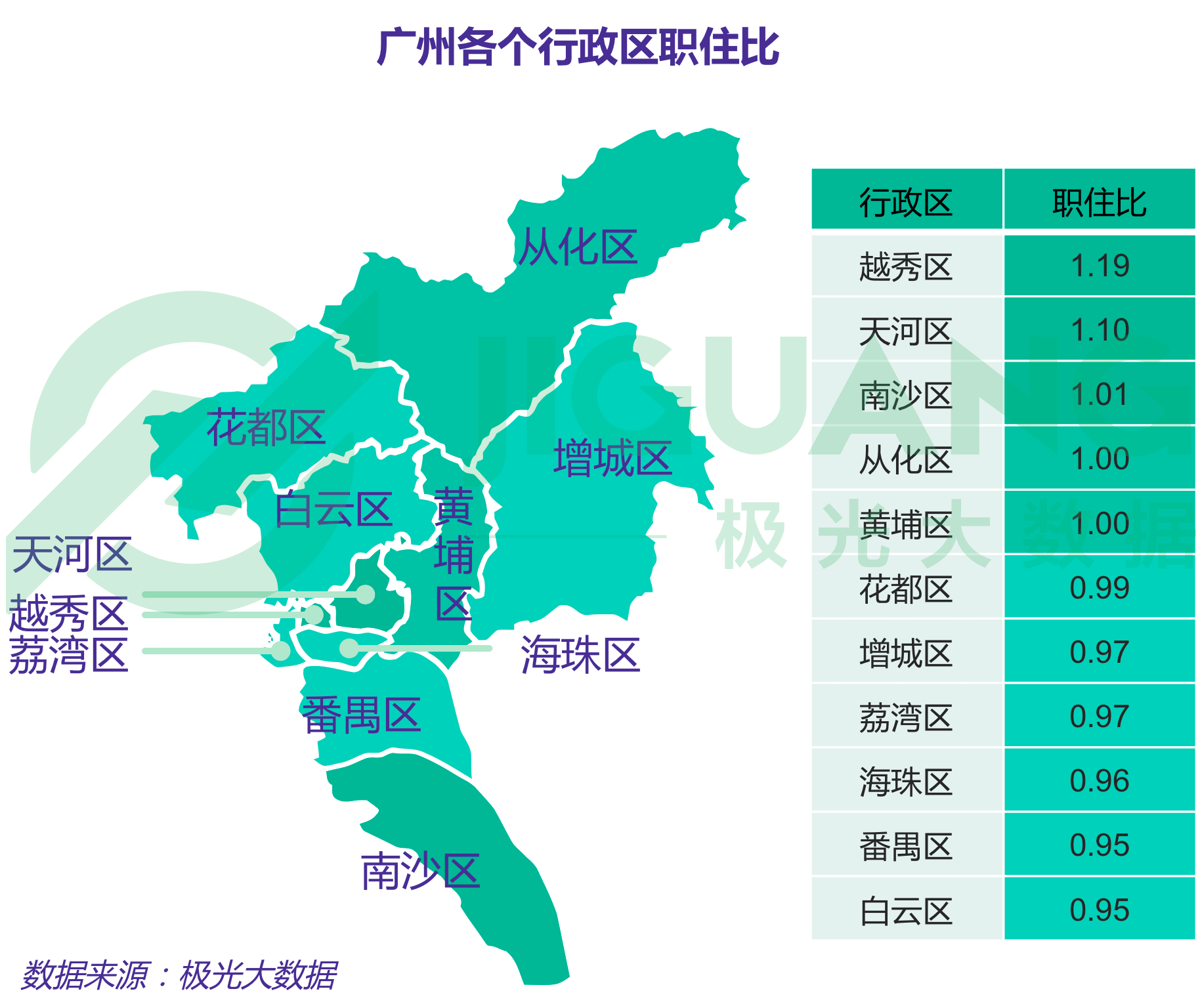 在广州主城区中,越秀区的职住比为1.19,天河区的职住比为1.10,而同为主城区的海珠区职住比为0.96,番禺区职住比为0.95。