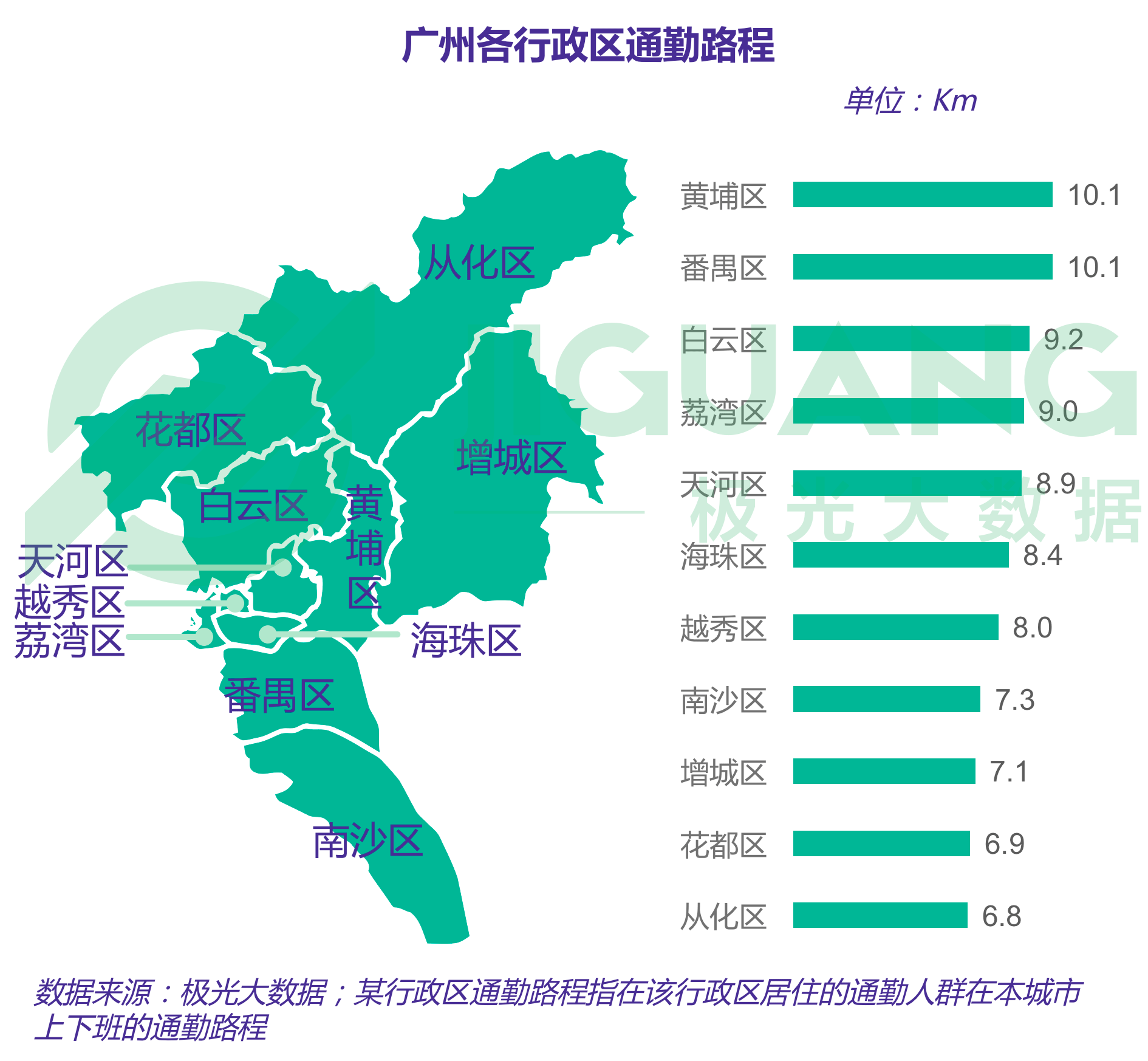 广州各行政区通勤路程比较中,黄埔区和番禺区的通勤路程均为10.1公里,白云区的通勤路程达9.2公里。