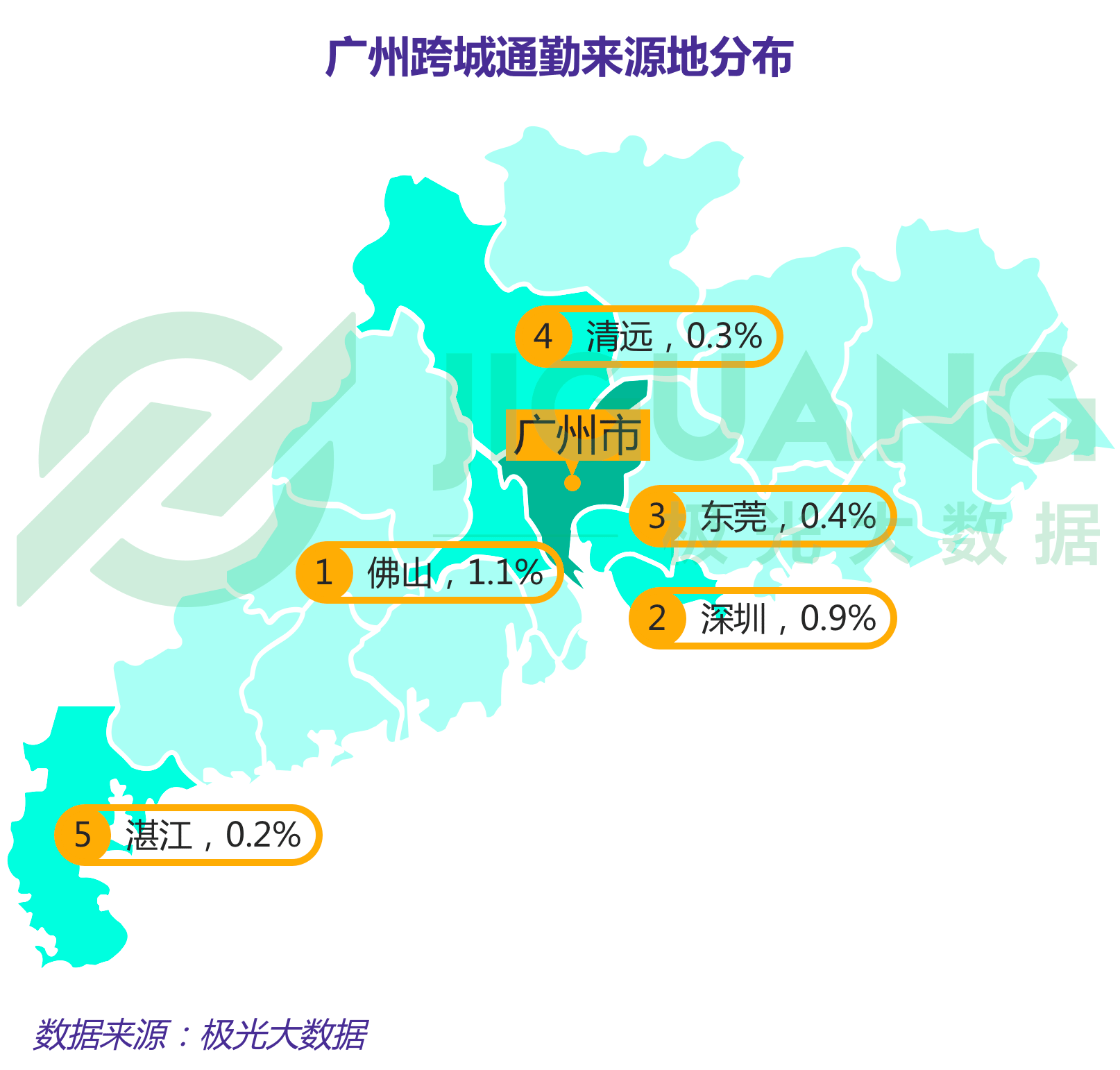 部分广州通勤人群选择跨城通勤,佛山、深圳、东莞是广州主要的跨城通勤来源地,在通勤人群中的占比分别达到1.1%,0.9%,0.4%。