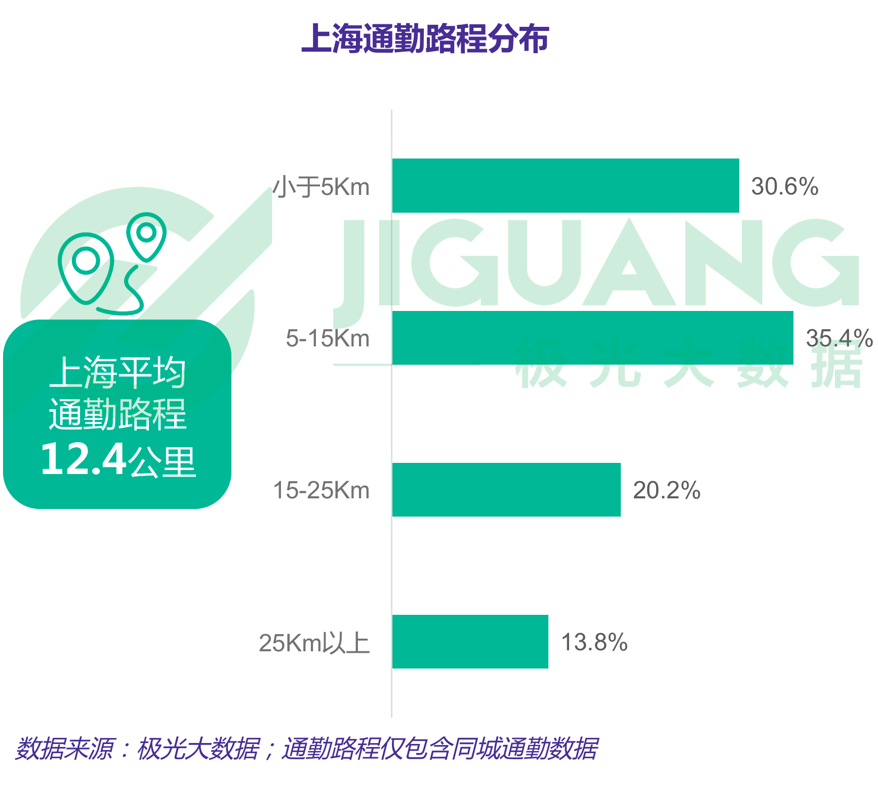 上海市平均通勤路程为12.4公里,其中,小于5公里通勤路程的通勤人群占比30.6%,35.4%的通勤人群通勤路程在5到15公里之间,20.2%的通勤人群通勤路程为15到25公里之间。