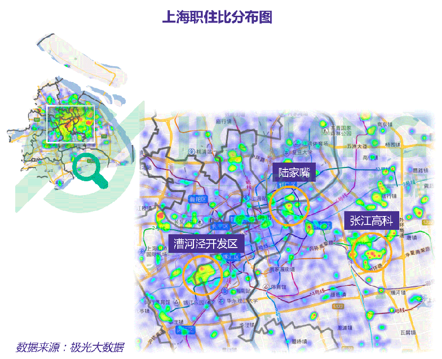 上海市职住比分布方面,陆家嘴CBD、国家级高新技术园区张江高科和经济开发区漕河泾开发区是上海是职住比相对较高的区域。