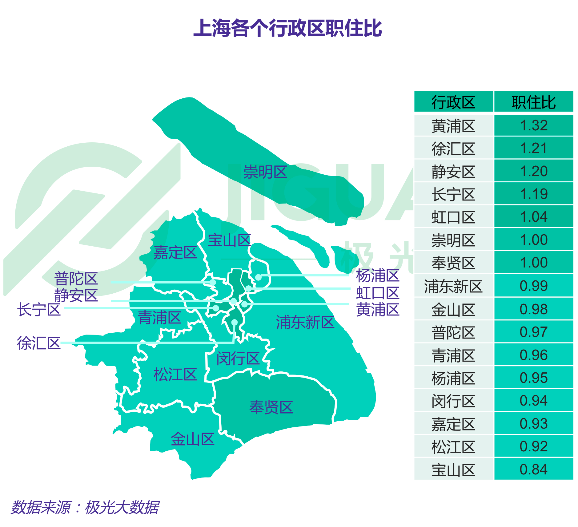 黄浦区、徐汇区和静安区为上海职住比最高的三个行政区域。黄浦区职住比为1.32,徐汇区职住比为1.21,静安区职住比为1.20,这三个区域是上海职住比最高的区域;嘉定区职住比是0.93,松江区职住比为0.92,宝山区为0.84,这三个区域是上海职住比最低的区域;而崇明区和奉贤区相对独立,职住比均为1。
