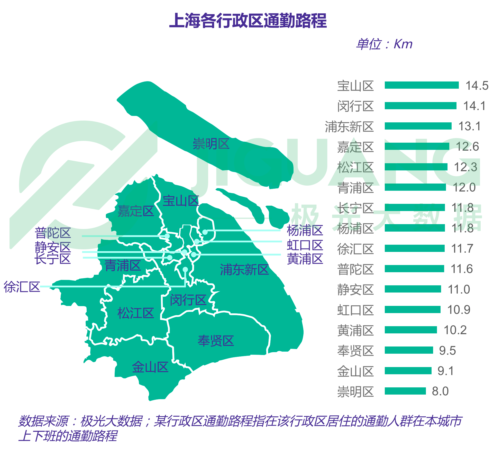 上海各行政区通勤路程比较中,宝山区通勤人群是上海市通勤路程最长的群体,其平均通勤路程达14.5公里;闵行区的通勤路程达14.1公里,浦东新区的通勤路程达13.1公里。