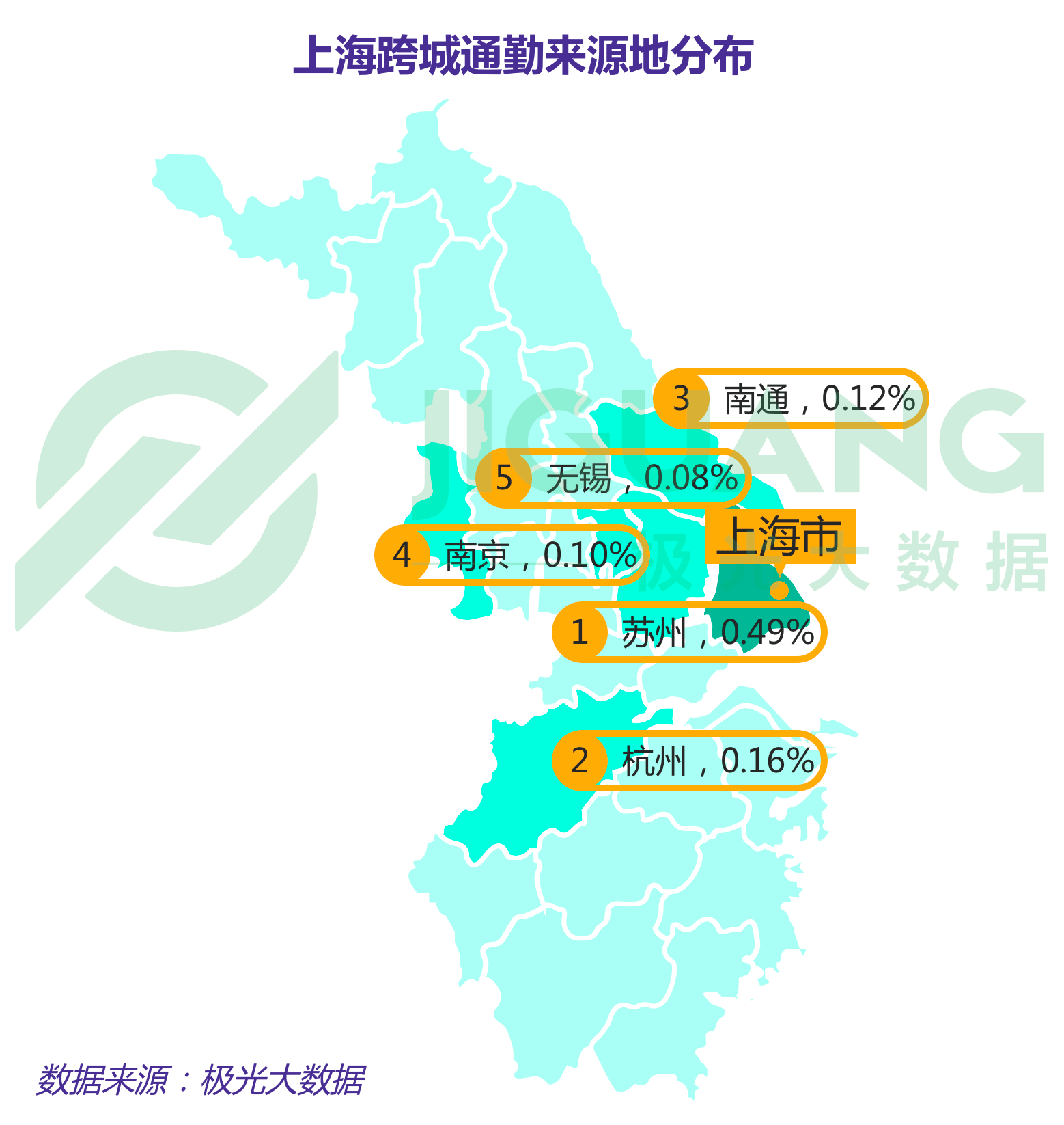 上海市跨城通勤的来源地主要是苏州、杭州和南通等城市。苏州-上海的跨城通勤人群占比达0.49%,杭州-上海的跨城通勤人群占比为0.16%,南通-上海的跨城通勤人群占比为0.12%。