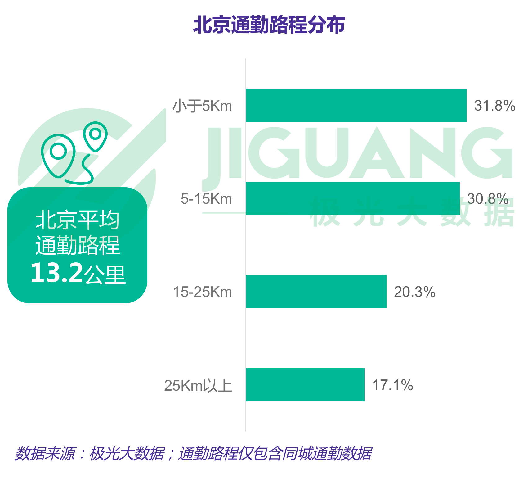 北京市通勤人群平均的通勤路程为13.2公里,其中小于5公里的人群占比31.8%,5到15公里之间的人群占比30.8%,15到25公里之间的人群占比20.3%;另外有17.1%的人群通勤路程超过25公里。
