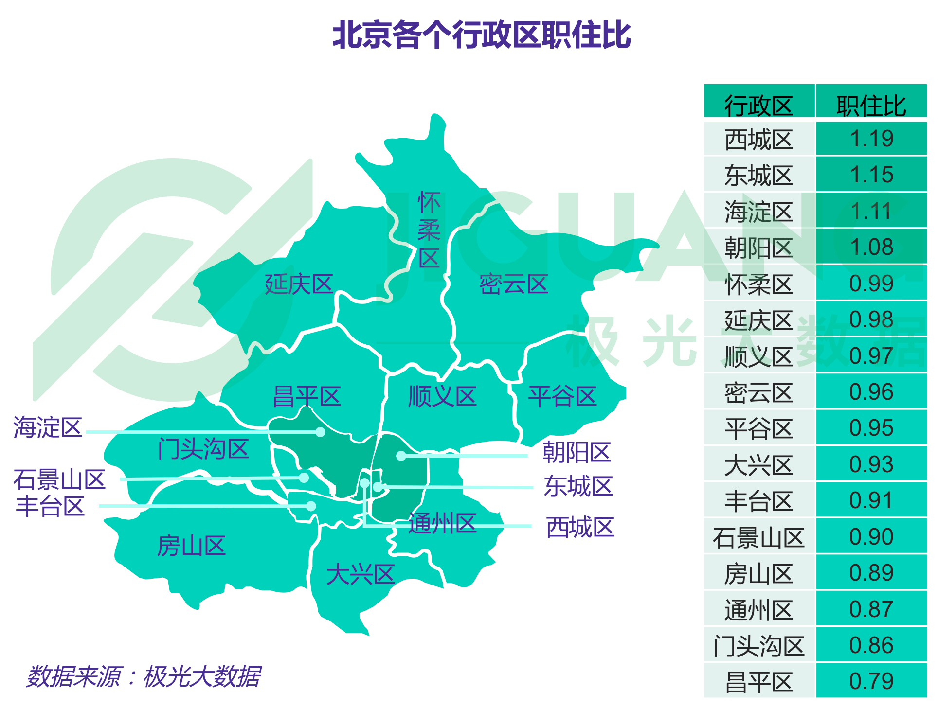 西城区、东城区和海淀区是北京职住比最高的三个行政区域,西城区的职住比达1.19,东城区的职住比达1.15,海淀区的职住比达1.11,朝阳区职住比达1.08,这是四个职住比大于1的区域;而通州区、门头沟区和昌平区职住比分别为0.87,0.86和0.79,是职住比最低的三个区域。