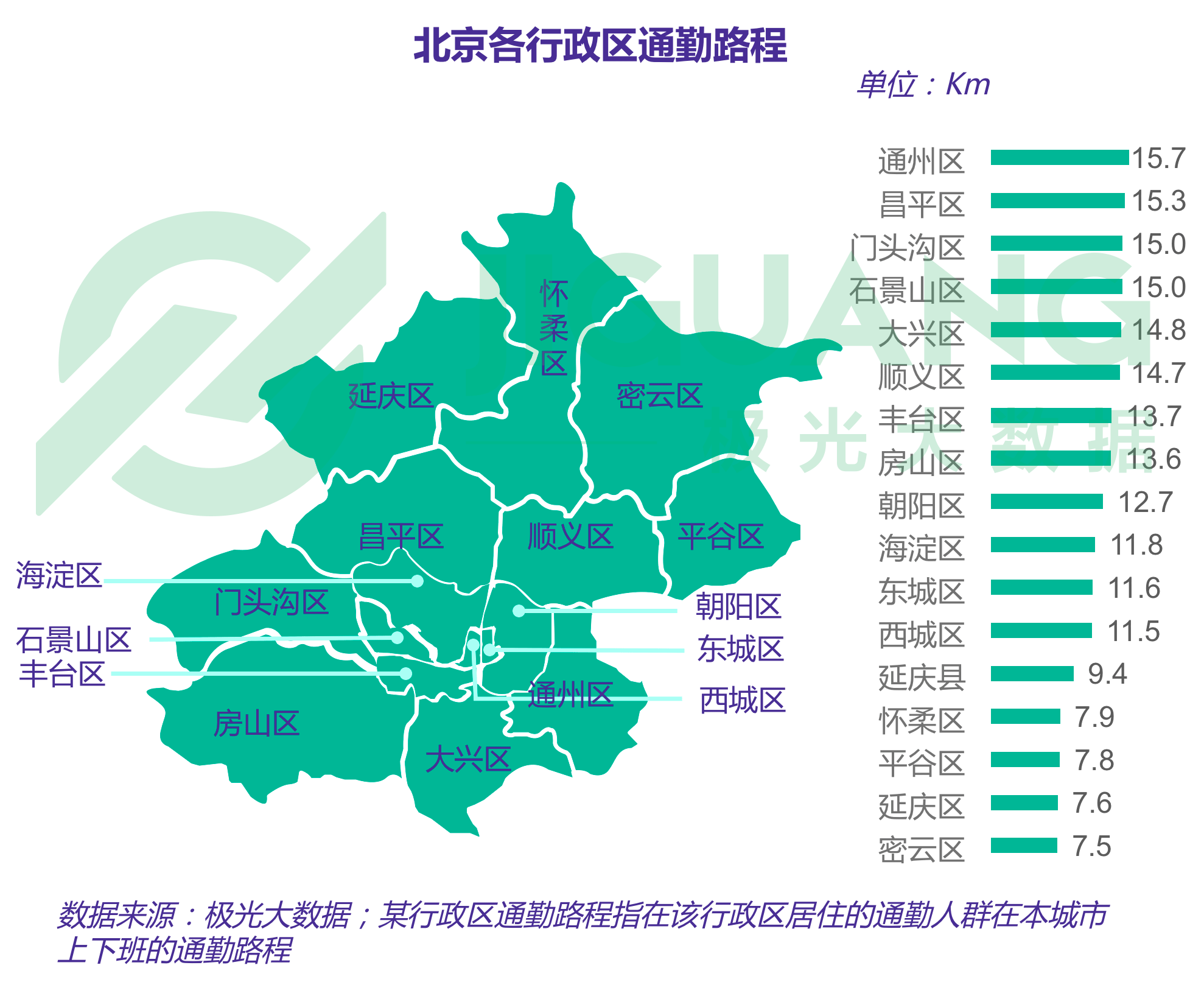 在北京的中心城市中,石景山区的通勤路程最长,达15公里,西城区的通勤路程较短,达11.5公里。