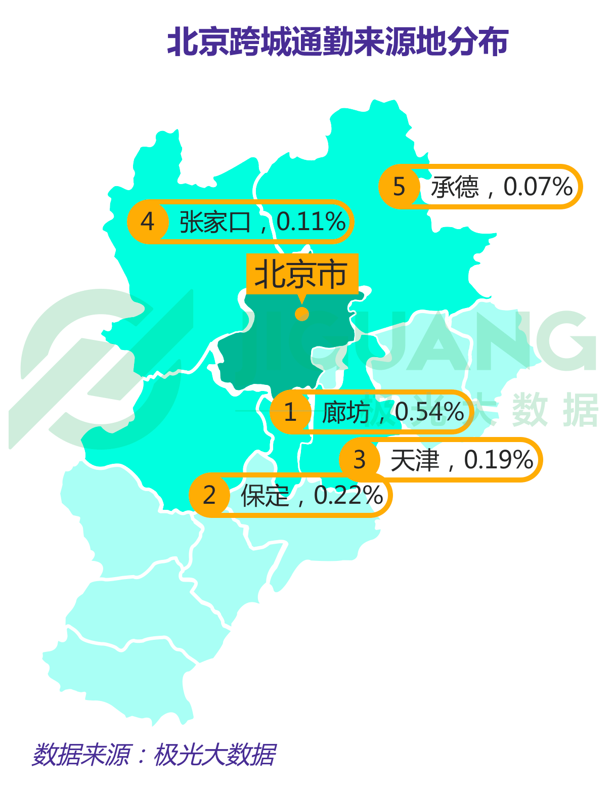 廊坊是北京主要的跨城通勤来源地,廊坊-北京跨城通勤人群在北京整体通勤群体中占比达0.54%。