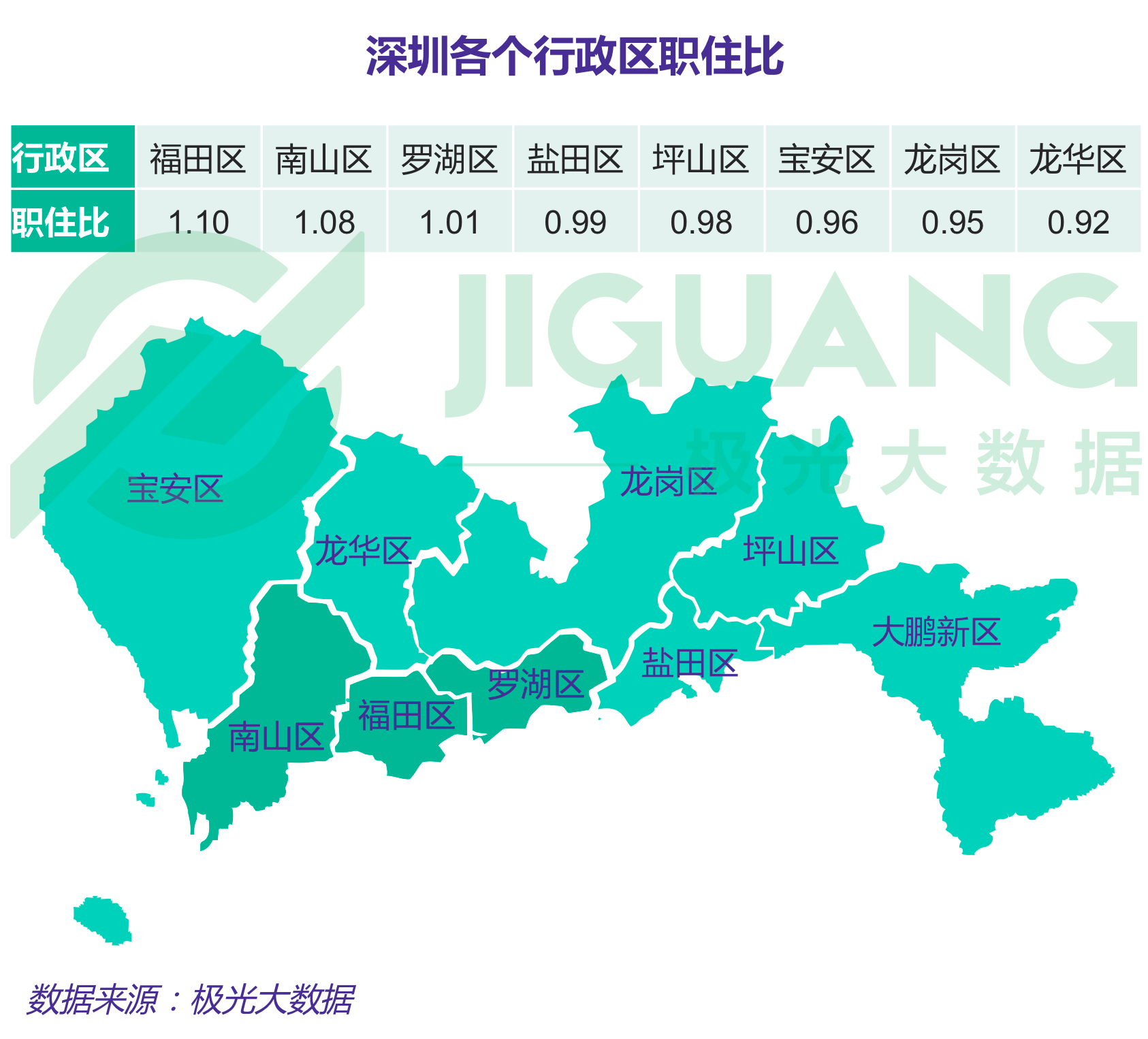 深圳市各区的职住比范围在0.9到1.1之间,各区职住比较为平衡;其中,福田区职住比为1.1,南山区职住比为1.08,罗湖区职住比为1.01。