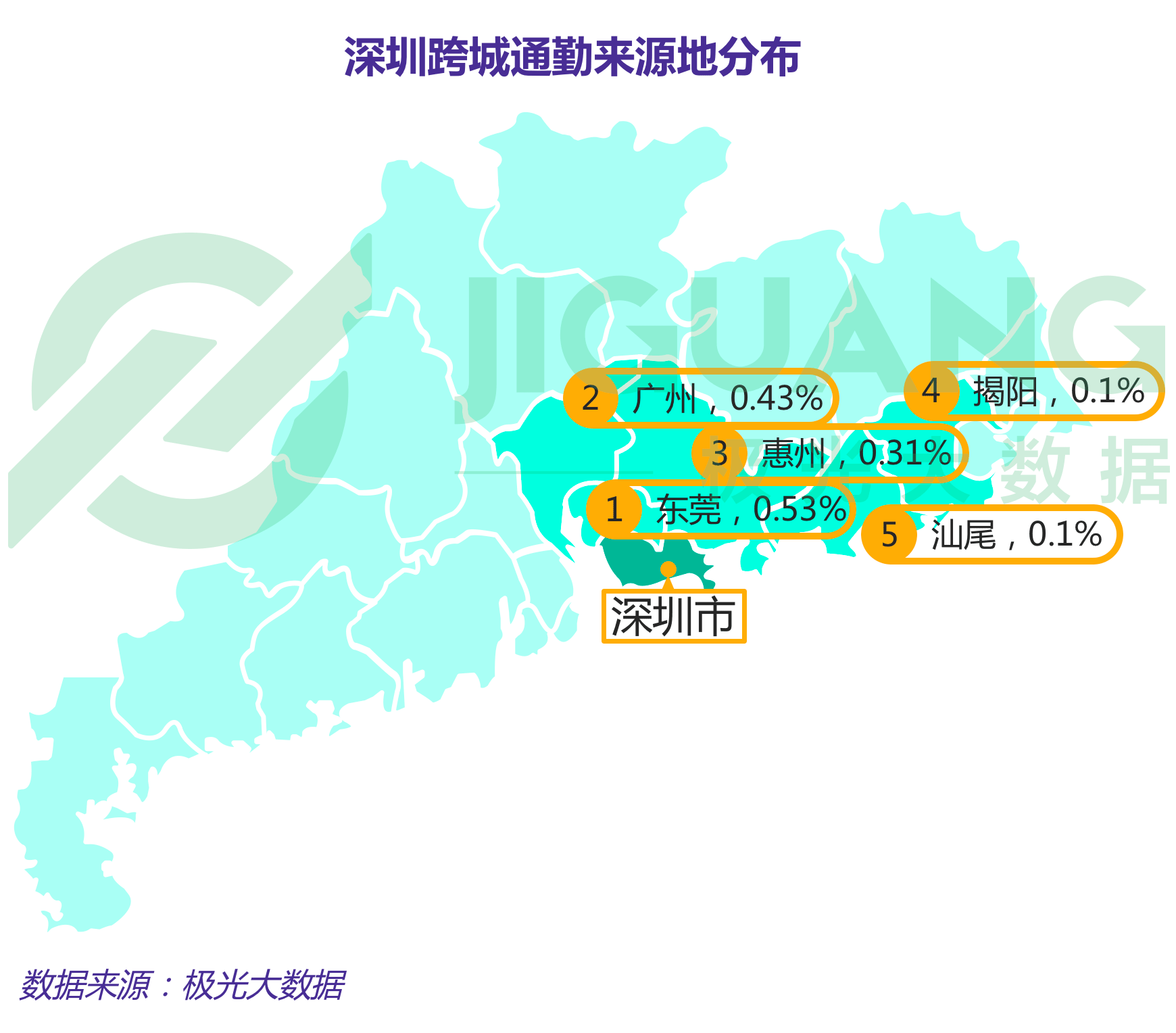 东莞是深圳跨区通勤人群的主要来源地,东莞-深圳的跨区通勤人群在深圳整体通勤人群中的占比达0.53%。