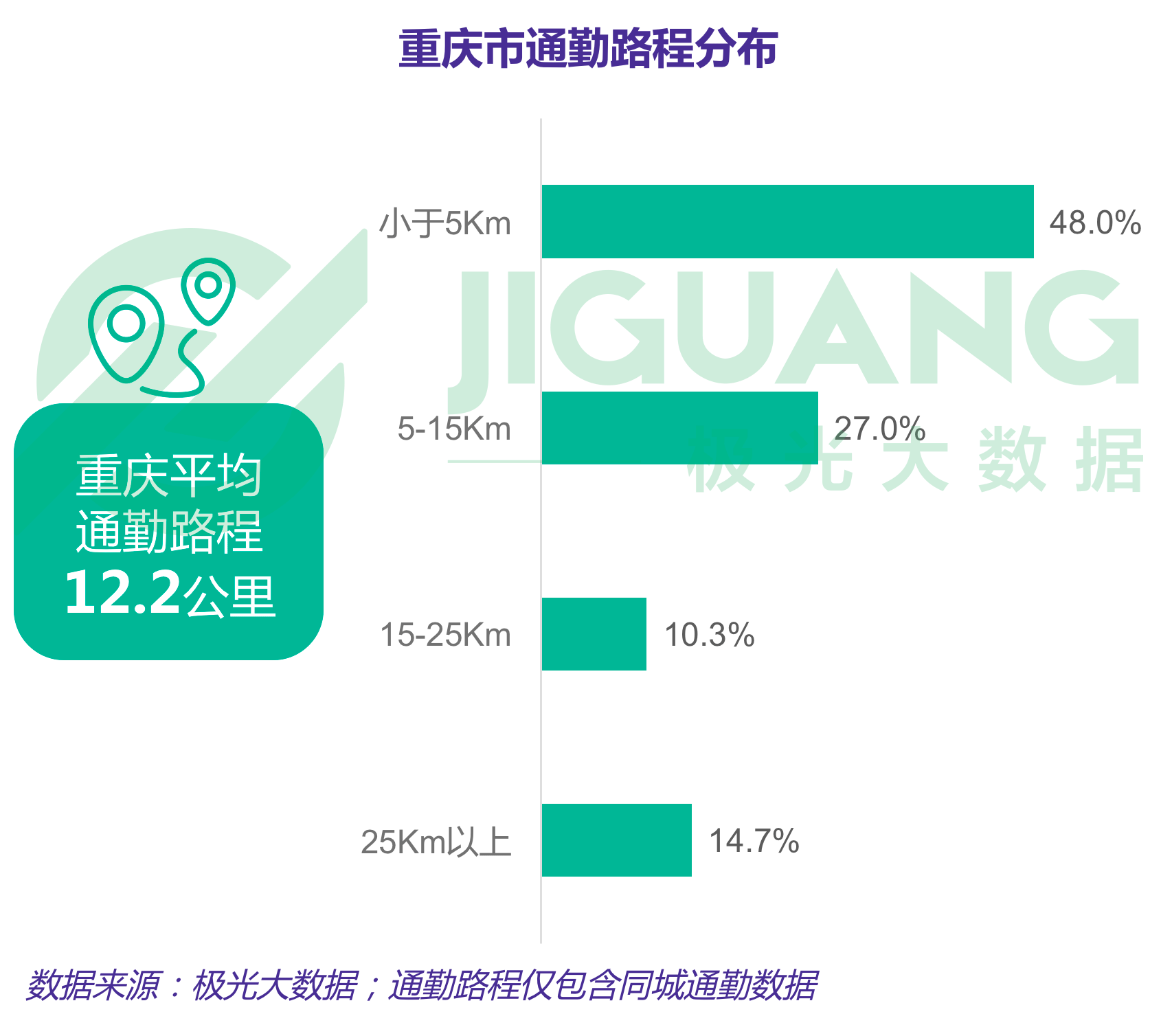 重庆市平均通勤路程是12.2公里,其中,小于5公里的人群占比48%,5到15公里之间通勤路程的人群占比27%,15到25公里之间通勤路程的人群占比为10.3%,超过25公里通勤路程的人群达14.7%。