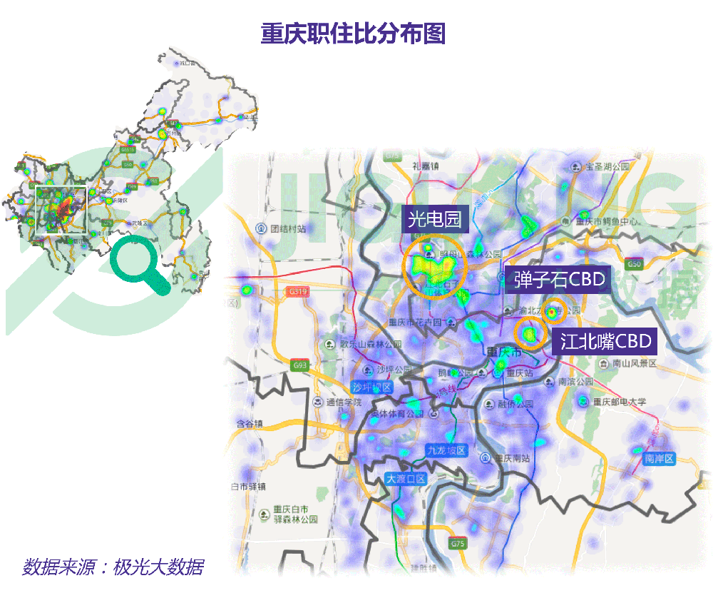重庆职住比分布图中,同属于重庆中央商务区“金三角”的江北嘴和弹子石是重庆职住比较高的区域;另外,位于两江新区的光电园也是重庆职住比较高的区域。