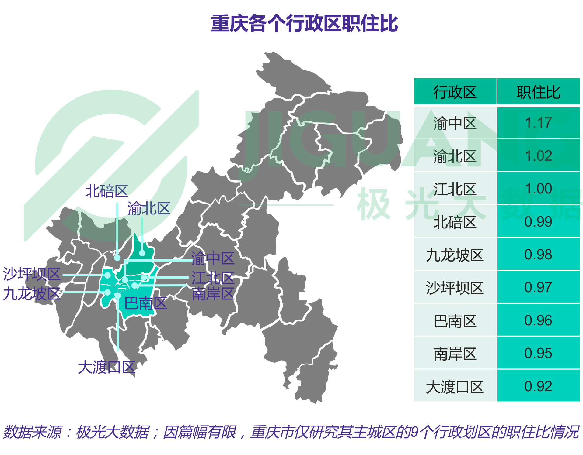 在重庆主城区中,渝中区职住比达1.17,渝北区职住比为1.02,江北区职住比为1。