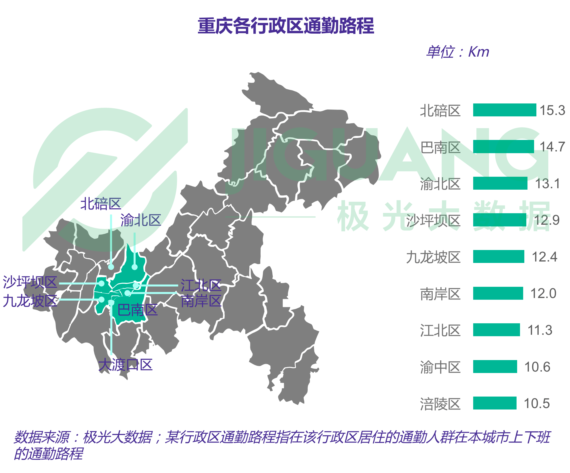 在重庆主城区中,北碚区的通勤路程最长,达15.3公里,巴南区的通勤路程达14.7公里,渝北区的通勤路程达13.1公里,3个区域位列主城区通勤路程前三名。