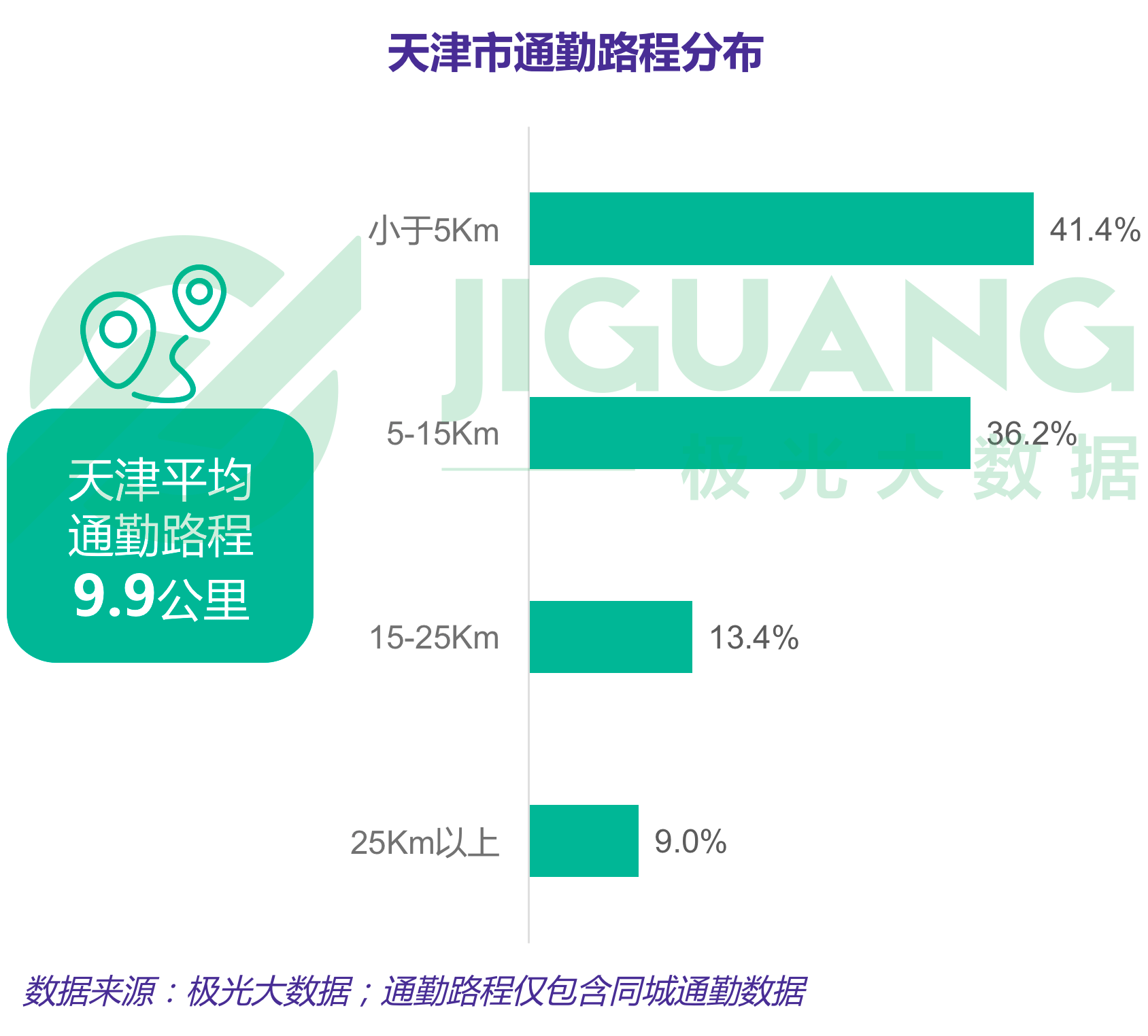 天津市的平均通勤路程为9.9公里,其中,小于5公里通勤路程的人群占比为41.4%,5到15公里之间通勤路程的人群占比为36.2%,15到25公里之间通勤路程的人群占比13.4%,超过25公里通勤路程的通勤人群占比9%。