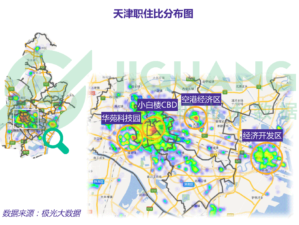 天津职住比分布中,小白楼CBD、高新区核心区华苑科技园、位于东丽区的空港经济区和滨海新区的经济开发区是天津职住比较高的区域。