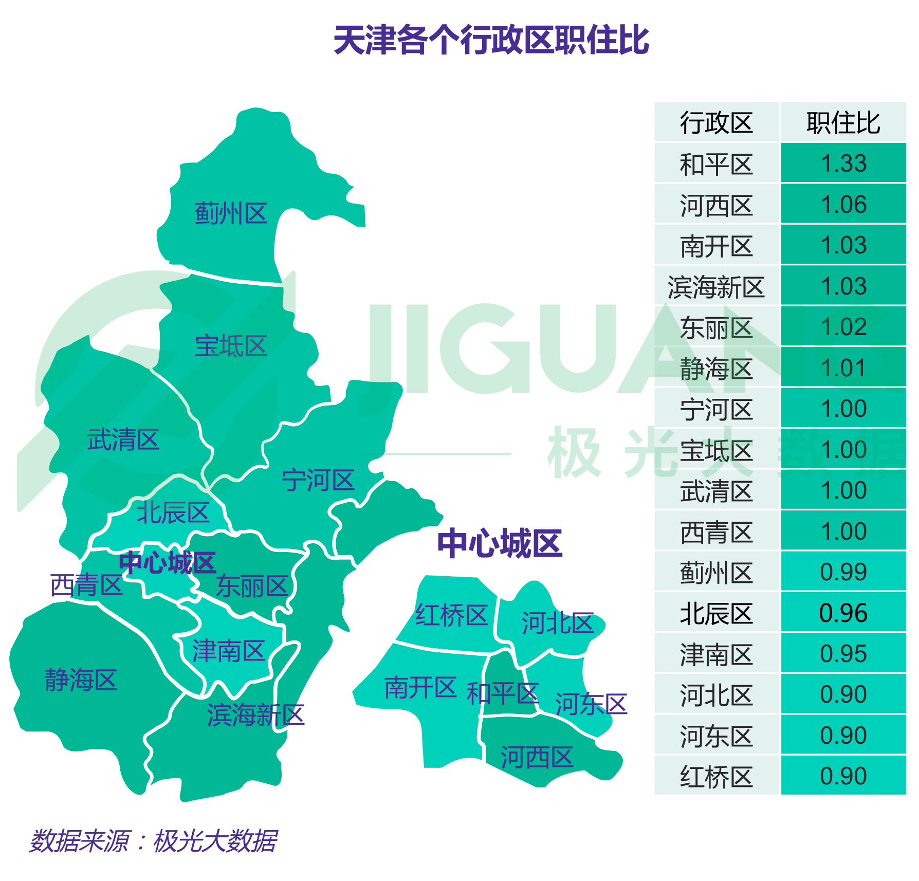 位于天津市中心的和平区职住比达1.33,同属中小城区的河北区、河东区和红桥区均为0.9。