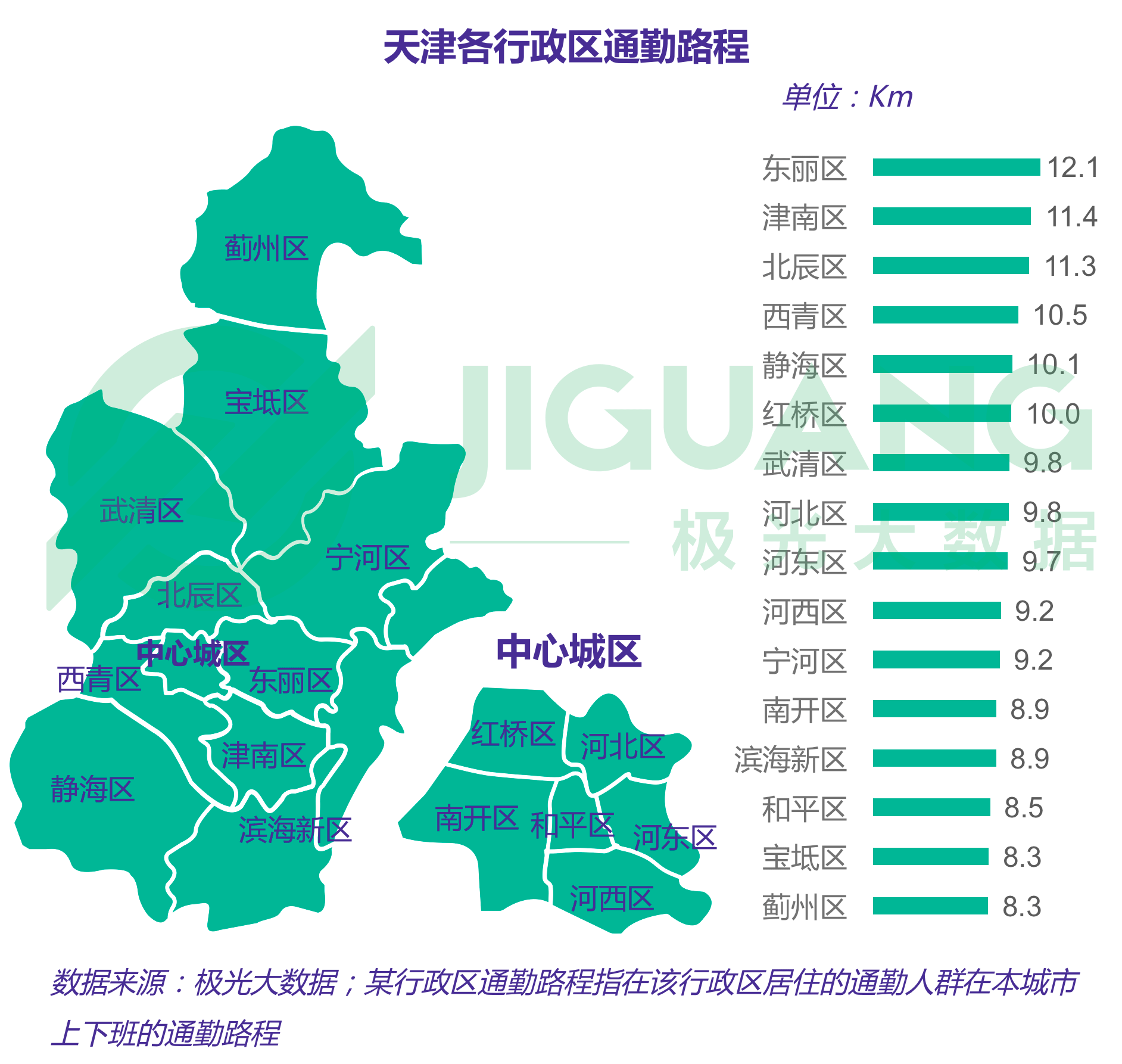 天津各行政区中,东丽区通勤路程达12.1公里,津南区通勤路程达11.4公里,北辰区通勤路程达11.3公里,是天津是通勤路程最长的三个区。