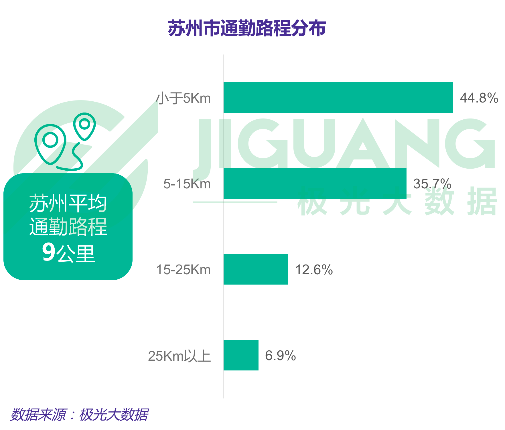 苏州市平均通勤路程为9公里,其中,小于5公里通勤路程的人群占比44.8%,5到15公里之间通勤路程人群占比35.7%,15到25公里之间通勤路程的人群占比达12.6%,超过25公里通勤路程的人群占比6.9%。